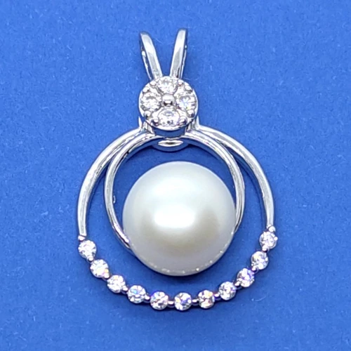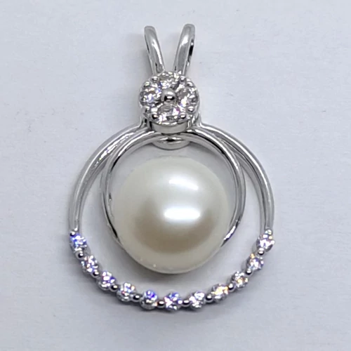 10 mm-es édesvizi tenyésztett gyönggel, dupla karikával, és fehér cirkon sorkővel kirakott, fix erlivel készített ezüst medál, melynek belső marikája mobil