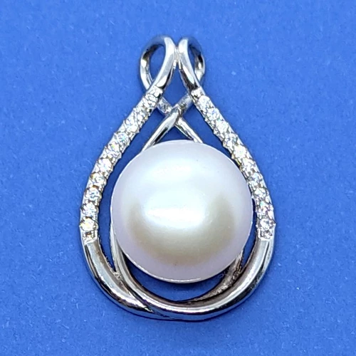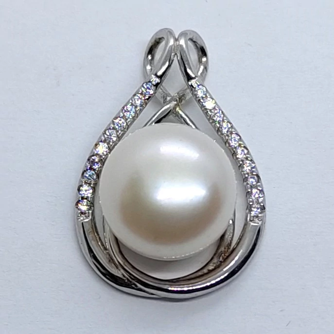12 mm-es édesvizi tenyésztett gyönggel, kereten fehér cirkon sorkővel kirakott csúsztatós erlivel ellátott különlrgesen szép ezüst medál