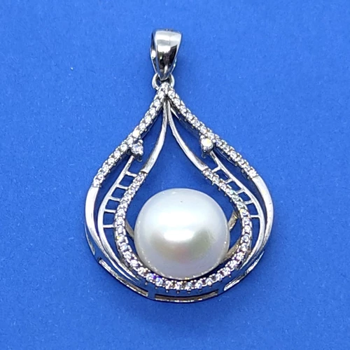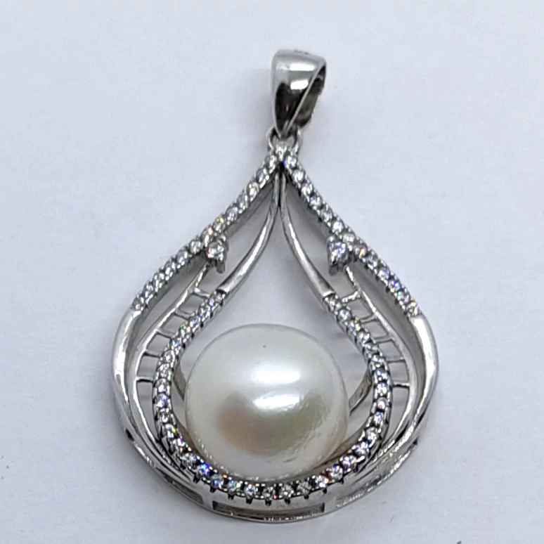 | 12 mm-es édesvizi tenyésztett gyönggel,díszített dupla csepp formájú, fehér cirkon sorkővel kirakott, extra kivitelű ezüst medál | |