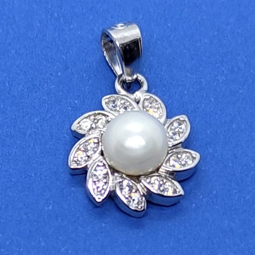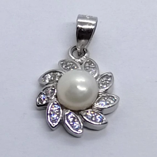 | 5 mm-es édesvizi tenyésztett gyöngy, cirkon kövekkel kirakott szirmokba épített ezüst medál | |