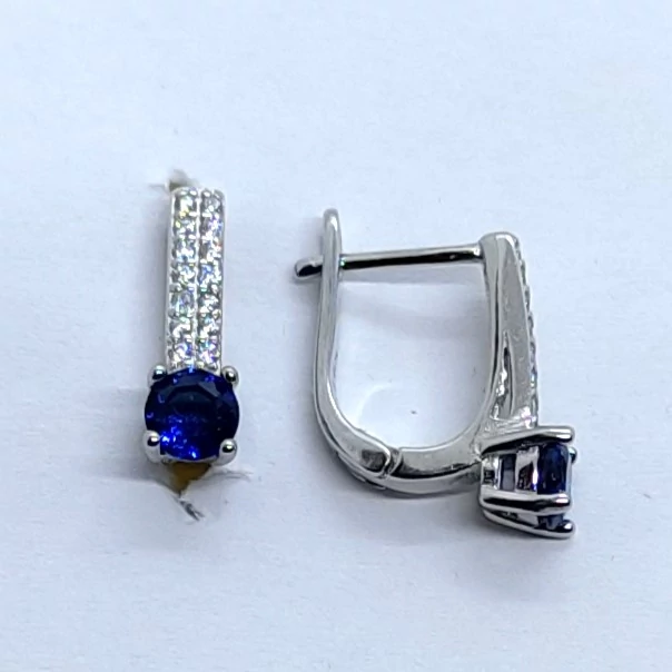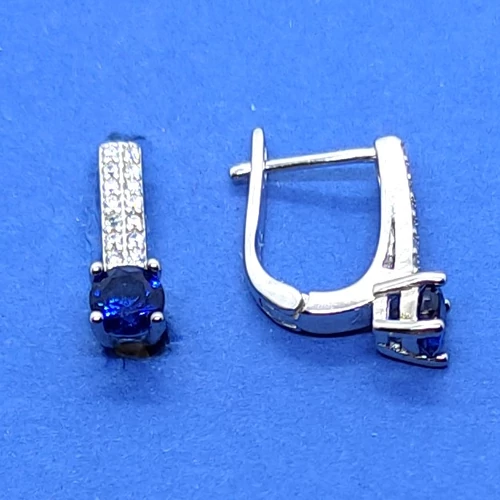 | Alsó részen 4 karomba foglalt kerek sötétkék köves, felűl fehér cirkon sorkővel díszített ezüst fülbevaló | |