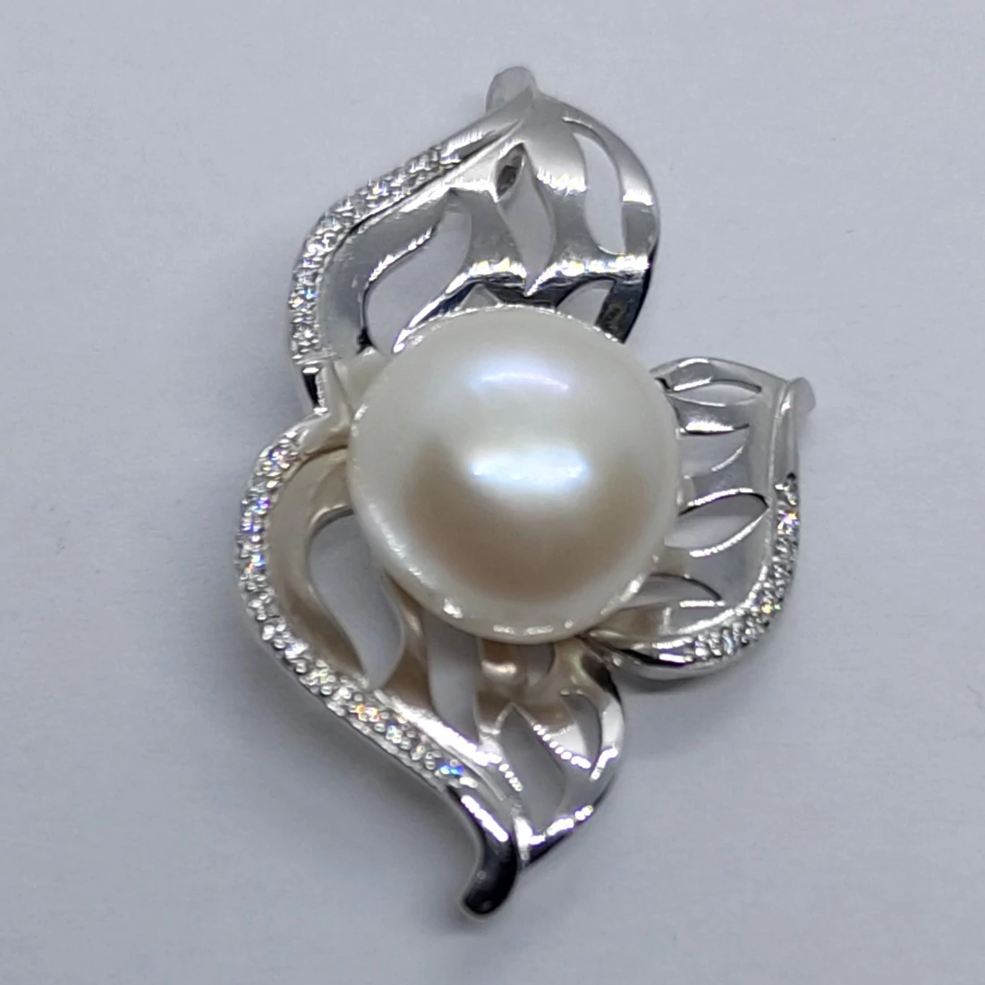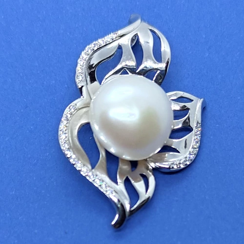 | Áttört szirmú, cirkon sorkővel díszített Lótusz virágra emlékeztető, csúsztatós erlivel ellátott ezüst medál, melynek közepébe egy 10 mm-es édesvizi tenyésztett gyöngyöt rögzítettek | |