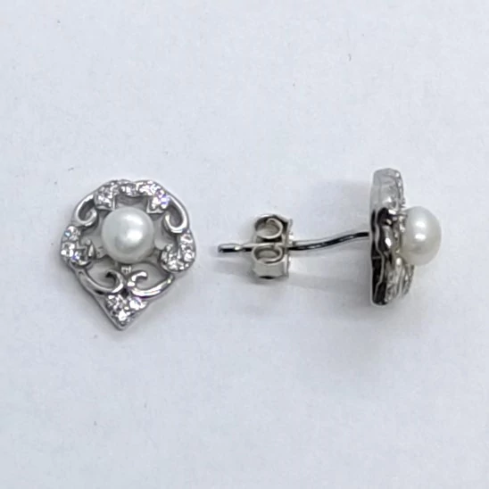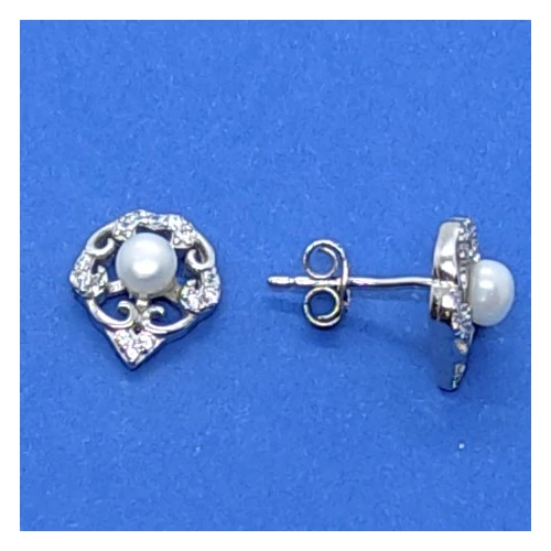 | Cirkon kővel díszített áttört mintájú középen 3 mm-es tenyésztett gyönggyel készített ezüst srófos fülbevaló | |