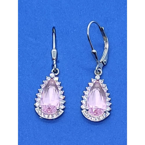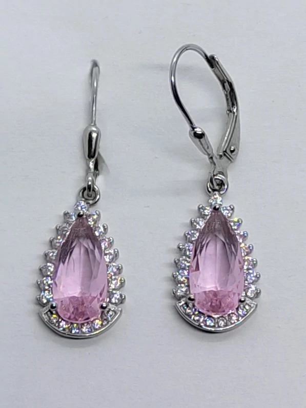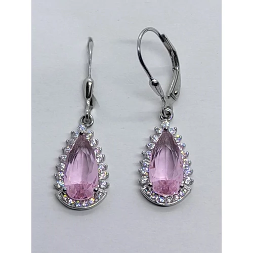 | Csepp formáljú fehér cirkon sorkővel keretezett 3 karomba foglalt rózsaszín cirkon köves ezüst fülbevaló | |