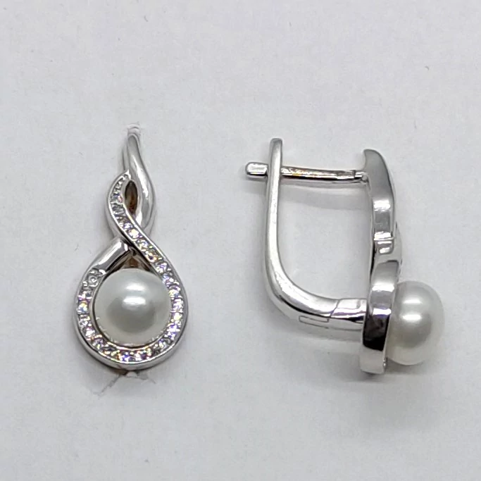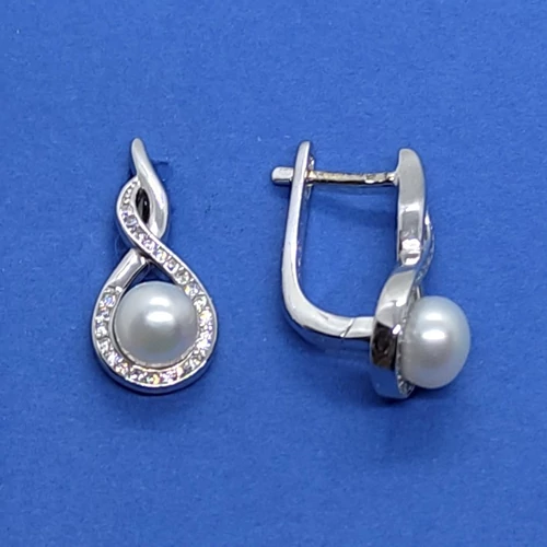 | Fehér cirkon sorkővel kirakott 8-as formába beépített 6 mm-es édesvizi tenyésztett gyönggyel készült ezüst fülbevaló | |