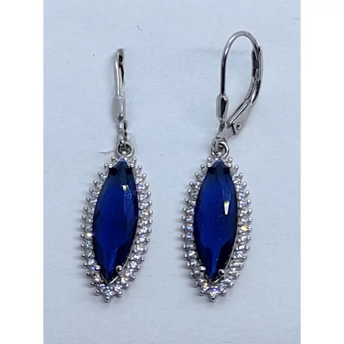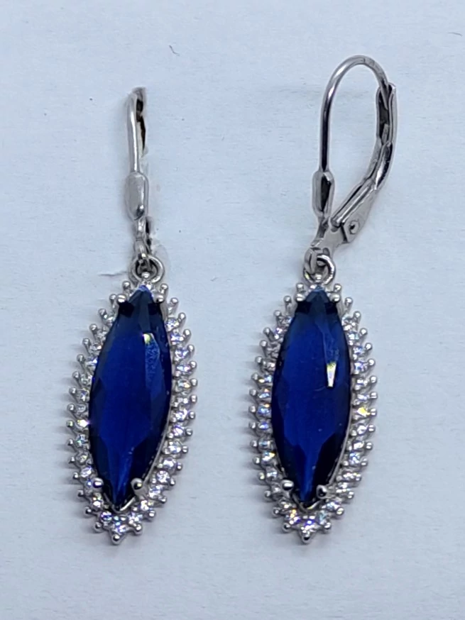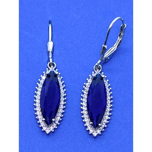 Fehér ciron sorkővel keretezett, csónak alakú sötétkék 4 karomba foglalt cirkon köves ezüst lógós fülbevaló