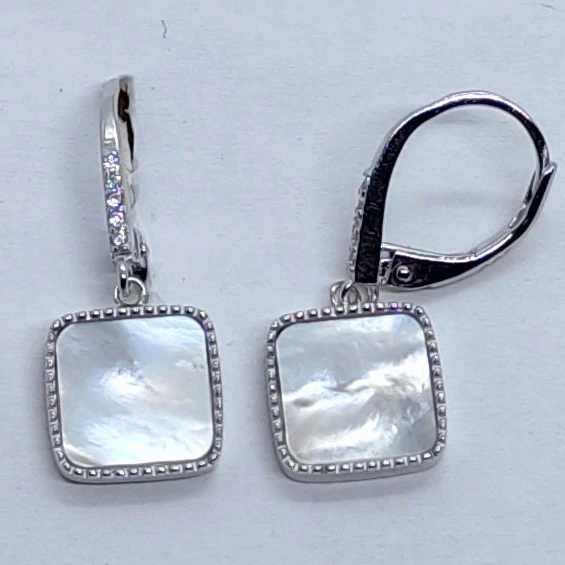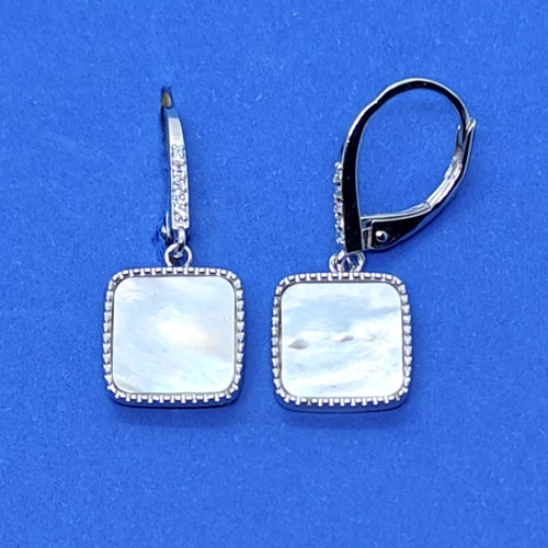 | Fehér ciron sorkővel keretezett, négyzet alakú gyöngyház kővel díszített ezüst lógós fülbevaló | |
