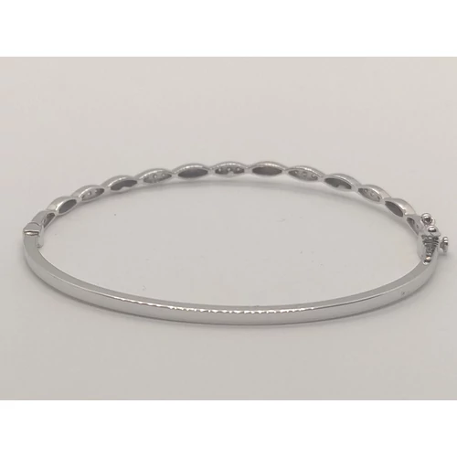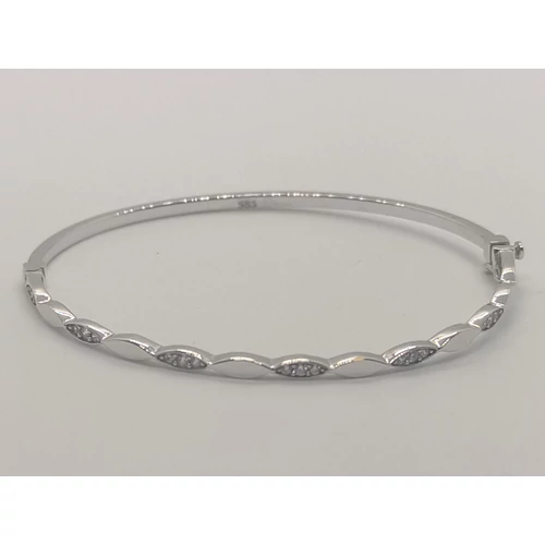 Fele részben mintás, cirkon kővel díszített fehérarany karkötő, melyet zsanérral, és biztonsági zárral láttak el