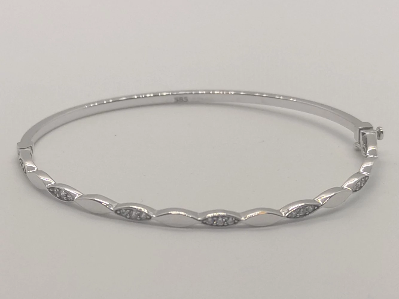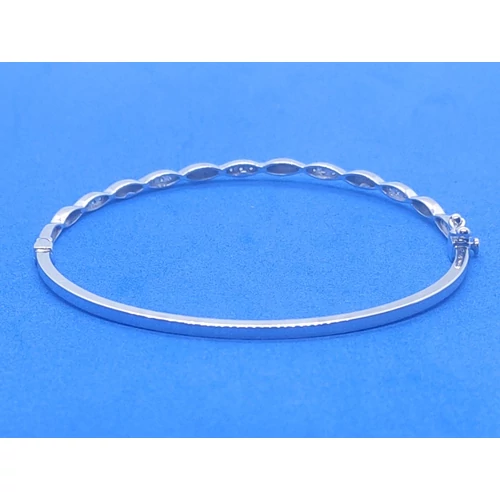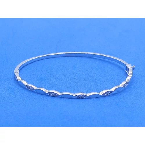 | Fele részben mintás, cirkon kővel díszített fehérarany karkötő, melyet zsanérral, és biztonsági zárral láttak el | |