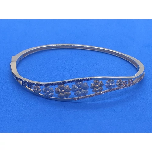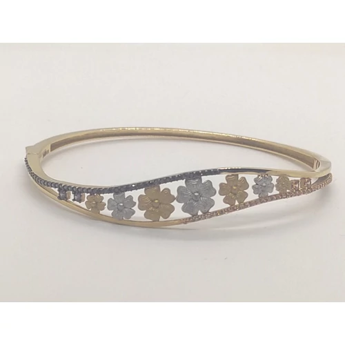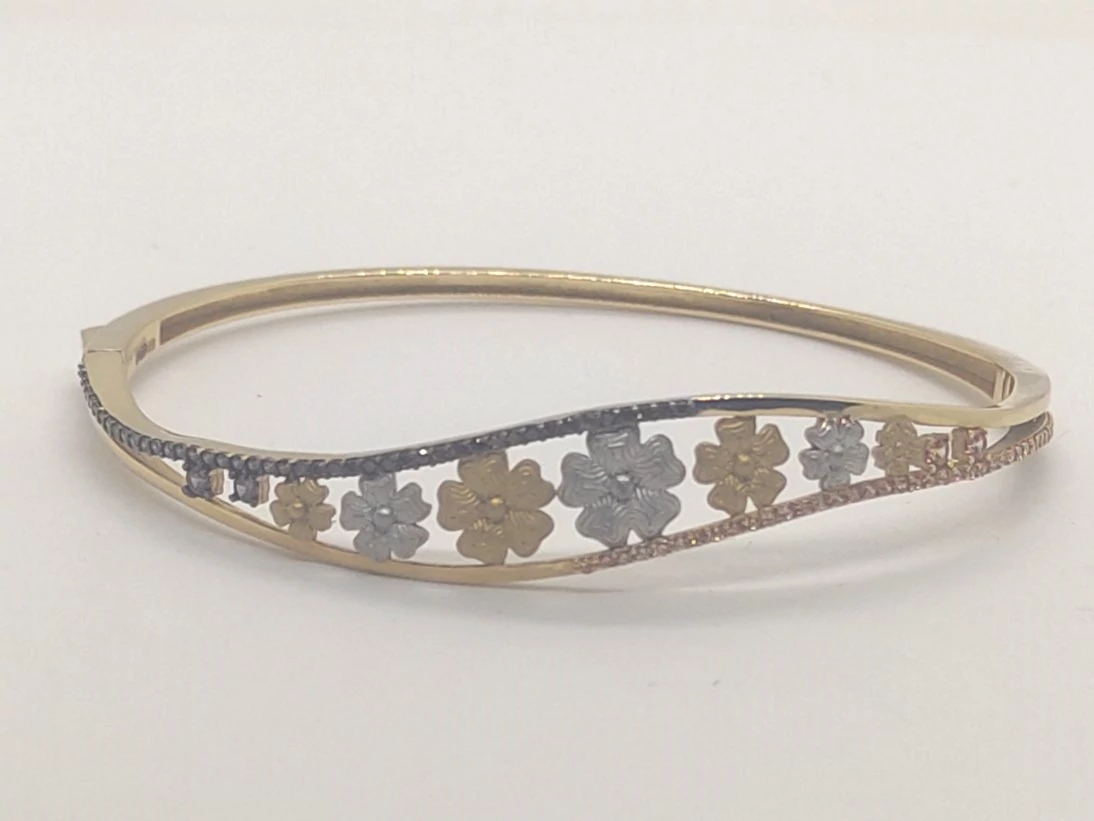 | Felső részen két hullám vonalú szállból készített, színeivel és virág mintályával gyönyörűen harmonizáló, zsanérosan nyíló és biztonsági zárral ellátott elegáns arany karkötő | |