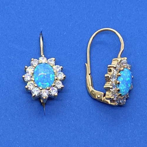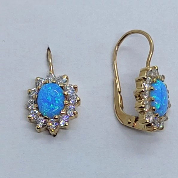 | Gyönyörű ovális kék opál arany fülbevaló, amelyet karmos foglalatú cirkon kövek kereteznek | |