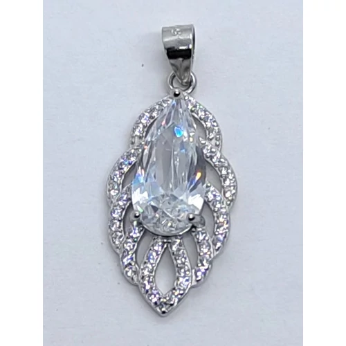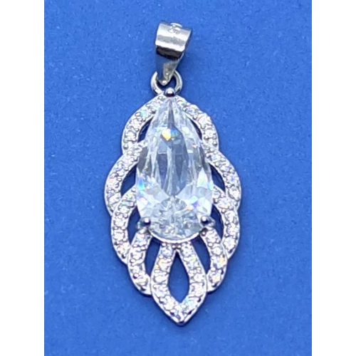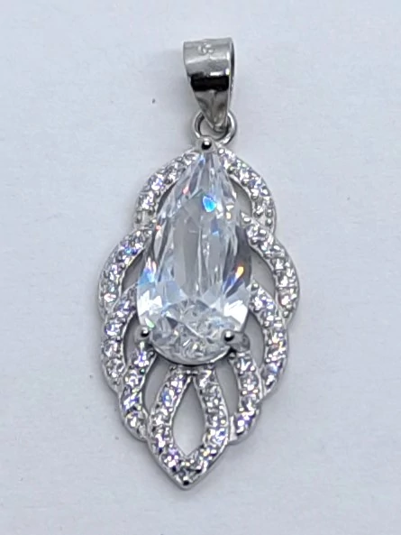 | Hosszukás levél formájú fehér cirkon kövekkel keretezett, 3 karomba foglalt csillogó fehér cirkon kővel díszített ezüst medál | |