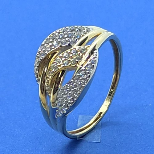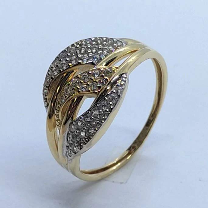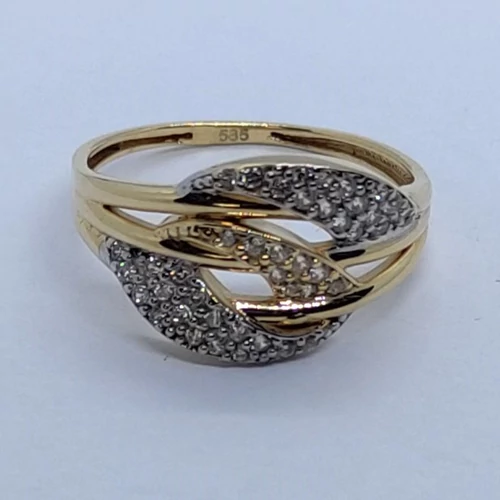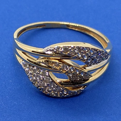 | Hullám vonalas széles fejrészű, cirkon kővel díszitett arany gyűrű | |