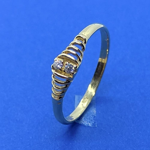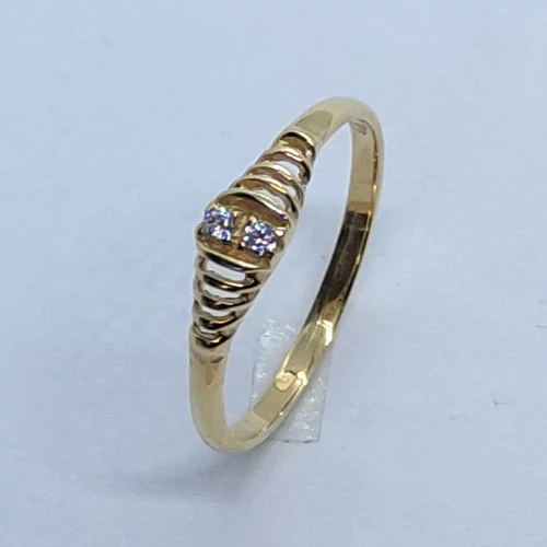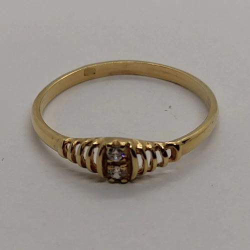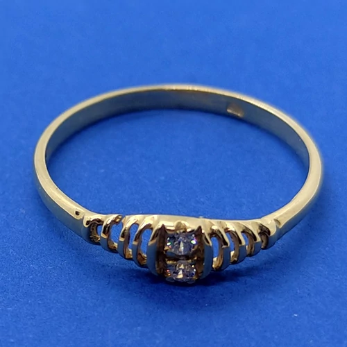 | Középen fehér cirkon kővel, két oldalt áttört mintával díszített arany gyűrű | |