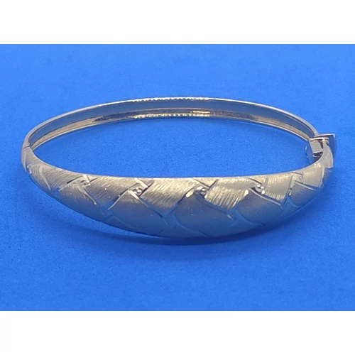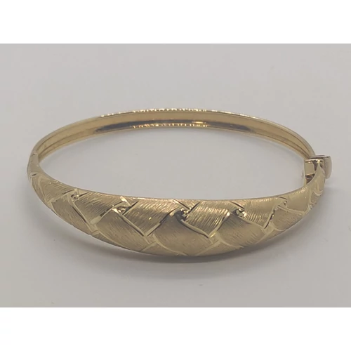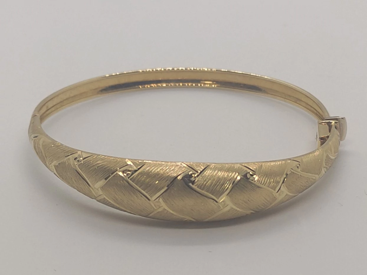 | Középen kiszélesedő, mattosított és csiszolt mintával készített elegánsan látványos, zsanérosan nyíló és biztonsági zárral ellátott arany karkötő | |