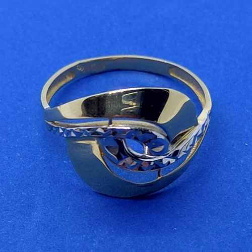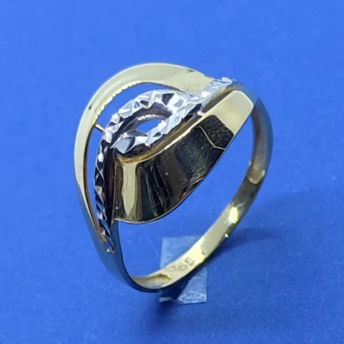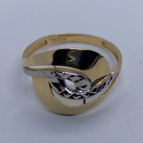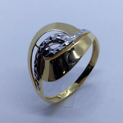 | Középen ródiummal, és gyémánt csiszolással díszített magas fényű hullám vonalú arany gyűrű | |