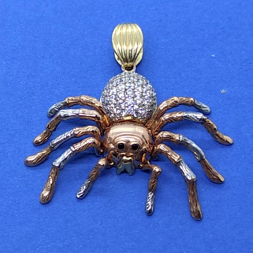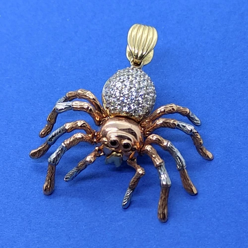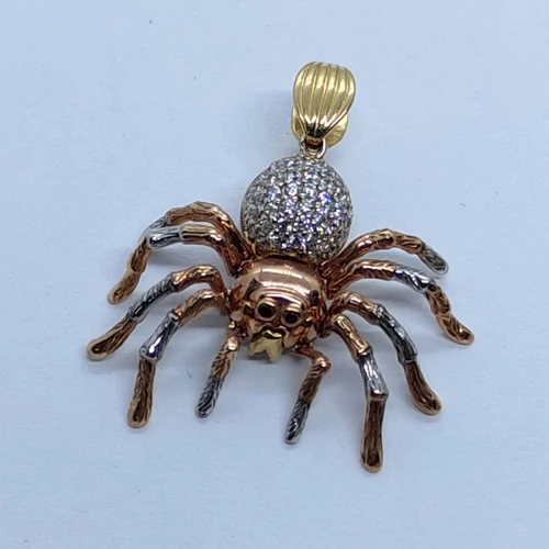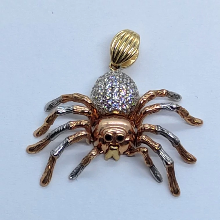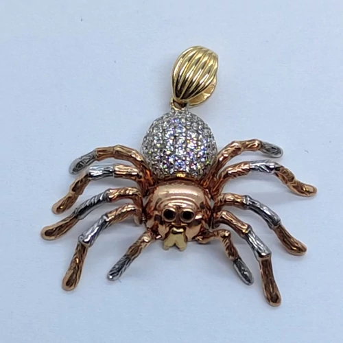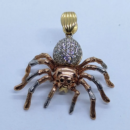 | Rendkívül különleges 3 színű aranyból készített mozgó lábú madárpók. A pók medál potroha, cirkon kövekkel van kirakva. | |