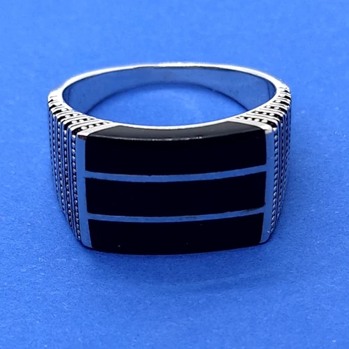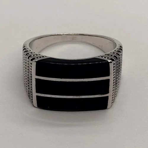 | Téglalap alakú Onix betétes középen két ezüst szállal díszített ezüst férfi gyűrű | |