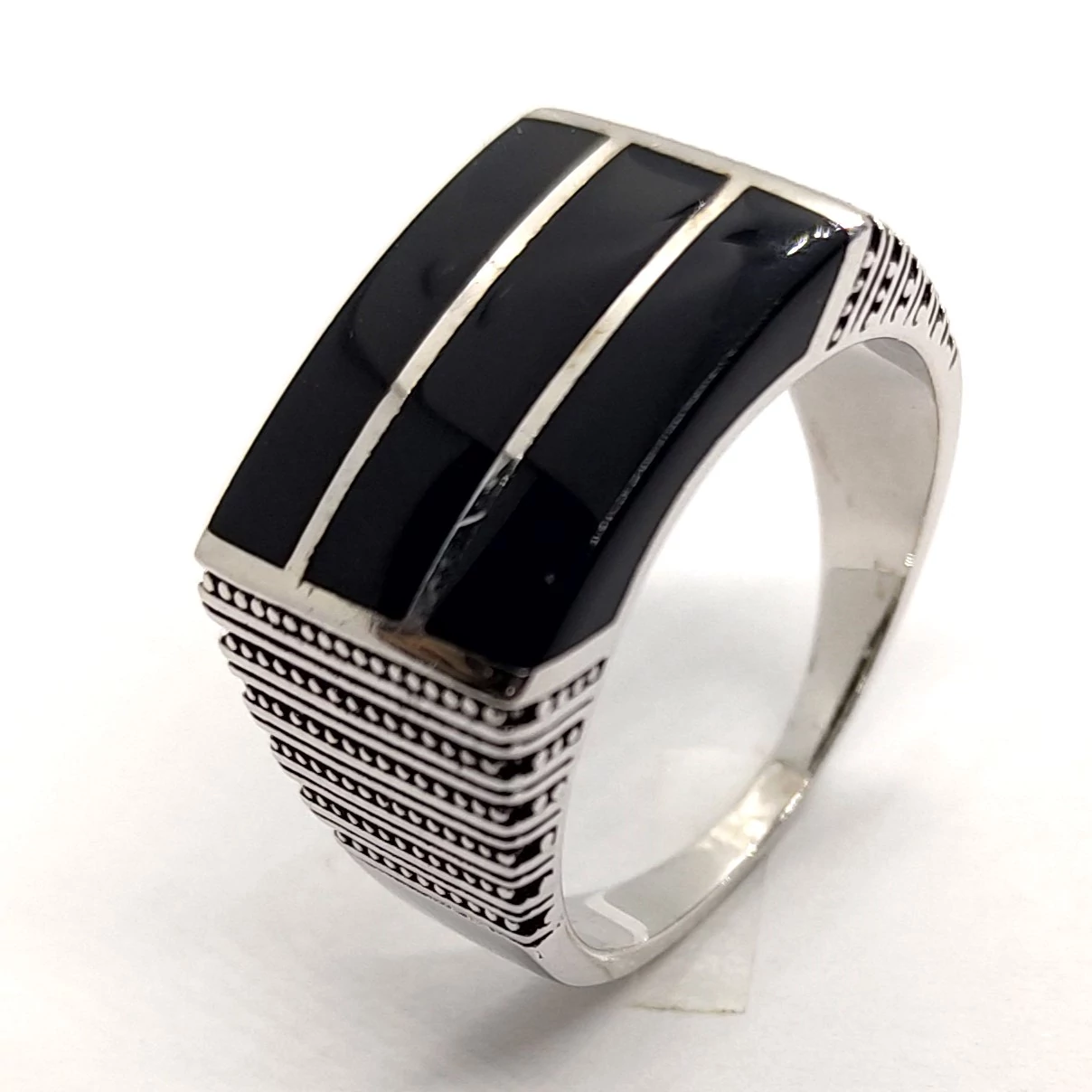 Téglalap alakú Onix betétes középen két ezüst szállal díszített ezüst férfi gyűrű