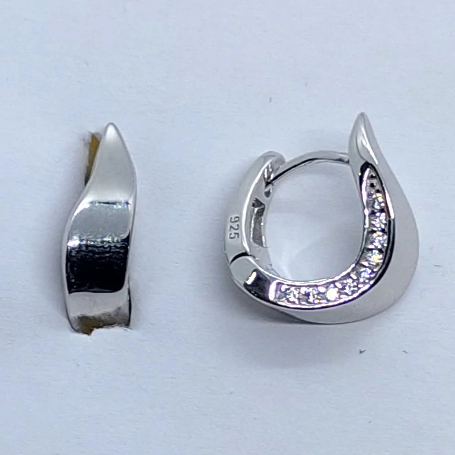 5 mm lefele szélesedő, hullám vonalú külső peremén cirkon kövekkel díszített ezüst karika fülbevaló