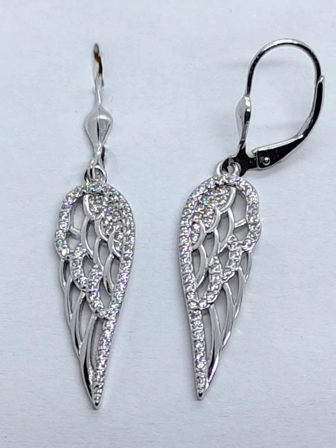 | Angyalszárny formájú, cirkon kövel díszített áttört mintás ezüst lógós fülbevaló | |