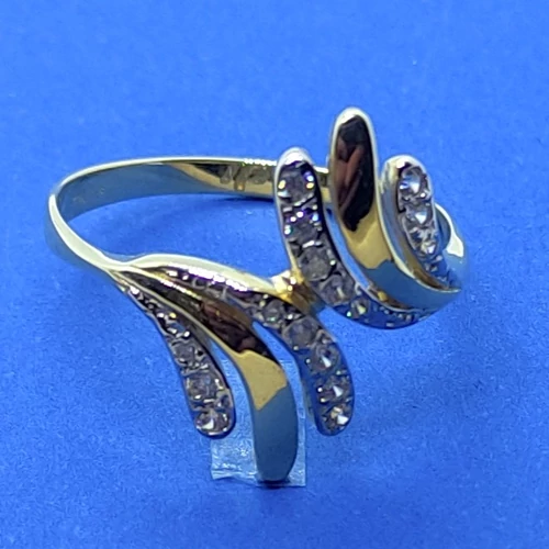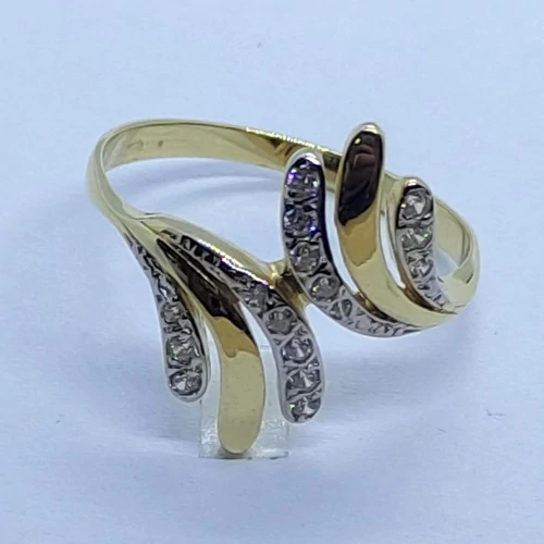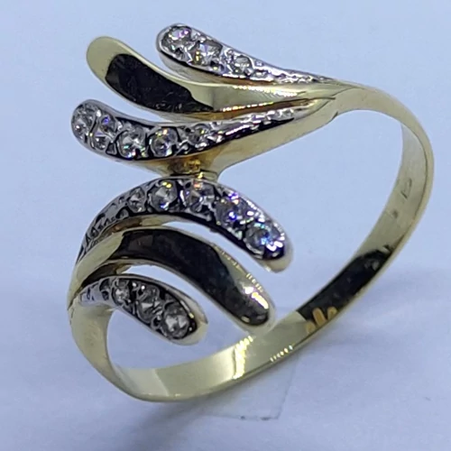 Asszimetrikusan eltolt két levél formára emlékeztető, fehér cirkon kövekkel díszített arany gyűrű