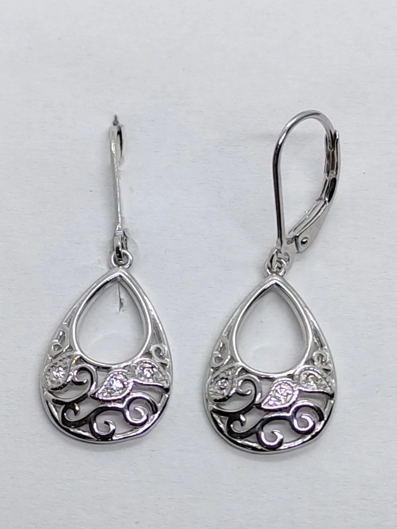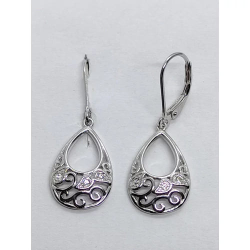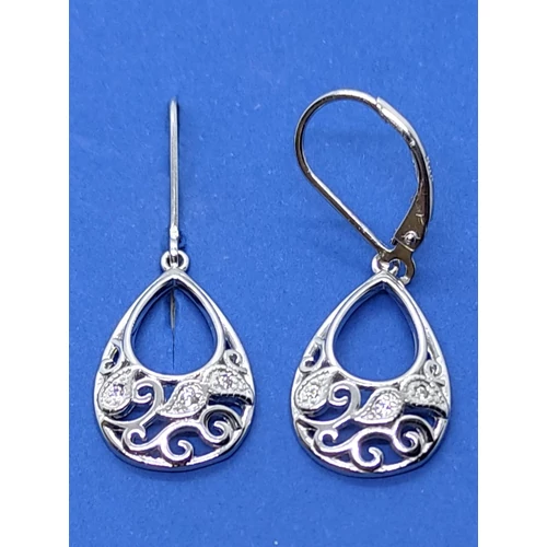 | Csepp alakú, szecesziós cirkon köves, árrört mintás ezüst lógós fülbevaló | |