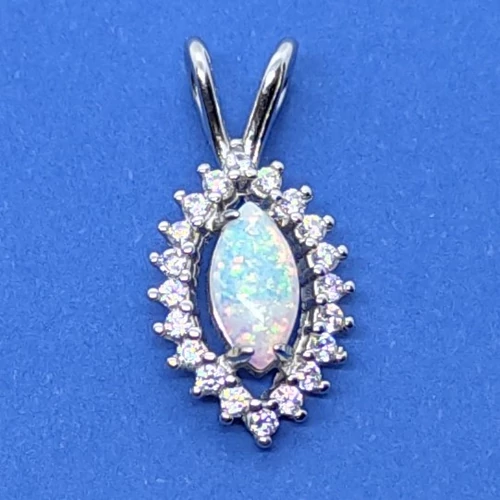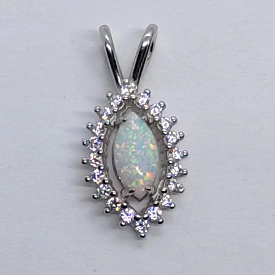 Csónak alakú fehér cirkon sorkővel keretezett 4 karonba foglalt fehér opál ezüst medál