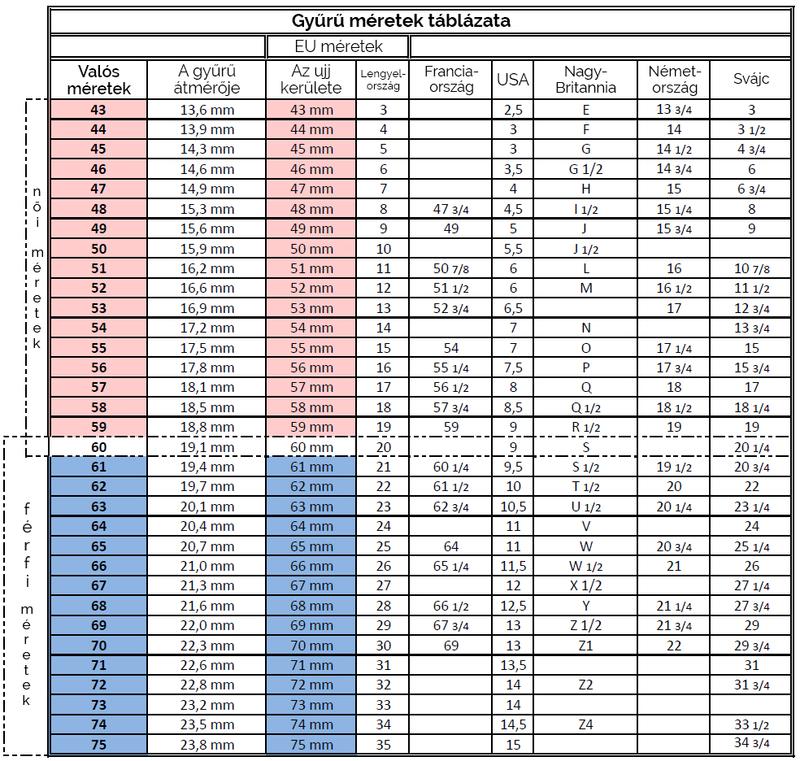 Ha ékszerboltban járunk, mindenképpen célszerű feljegyzetelni a méretet, amit helyben gyűrűmérő sor segítségével néznek meg, mert a későbbiek folyamán hasznos lehet, esetleg kedvesünk tudtára is adhatjuk, megkönnyítve ezzel a helyzetét, ha gyűrűt szeretne vásárolni számunkra. Minden ékszerboltban más mérettel dolgoznak, ezért itt találsz egy gyűrűméret táblázatot, amely segítségével kikeresheted a méreted.