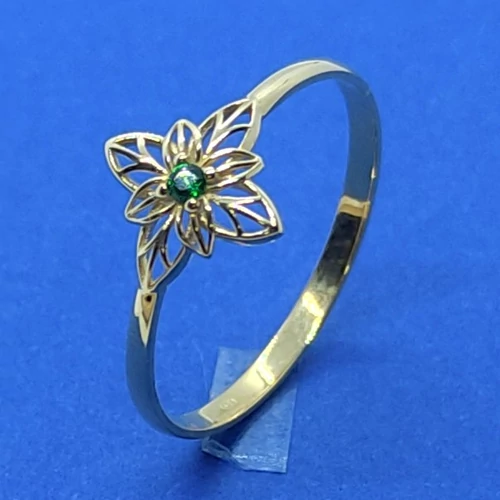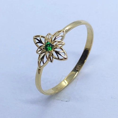 Hosszukás virág alakú, középen zöld cirkon kővel díszített áttört mintás arany gyűrű