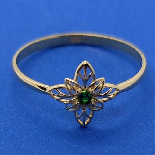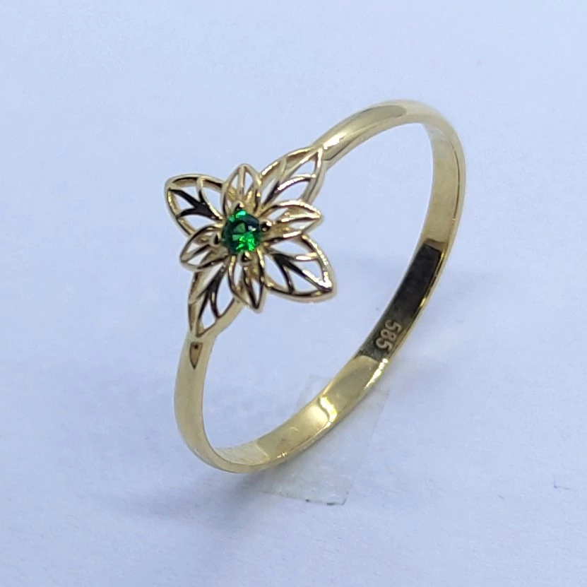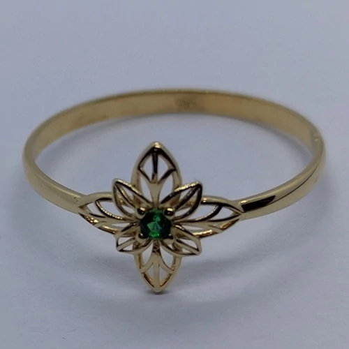 Hosszukás virág alakú, középen zöld cirkon kővel díszített áttört mintás arany gyűrű | |