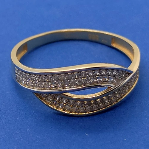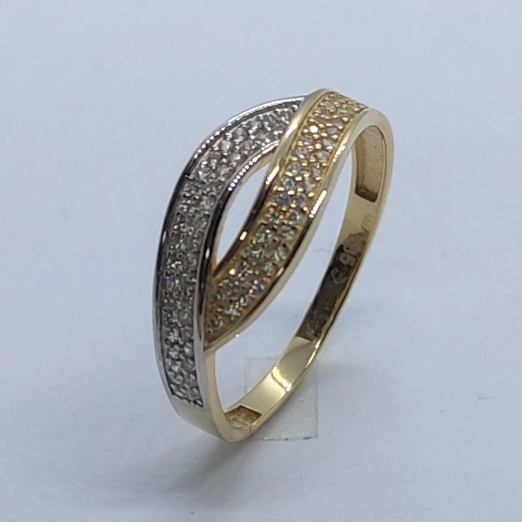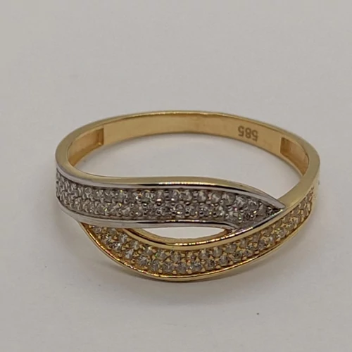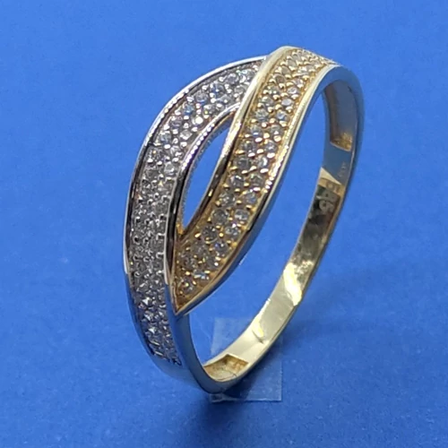| Hullám vonalú, bicolor fehér cierkon sorkövekkel kirakott arany gyűrű | |
