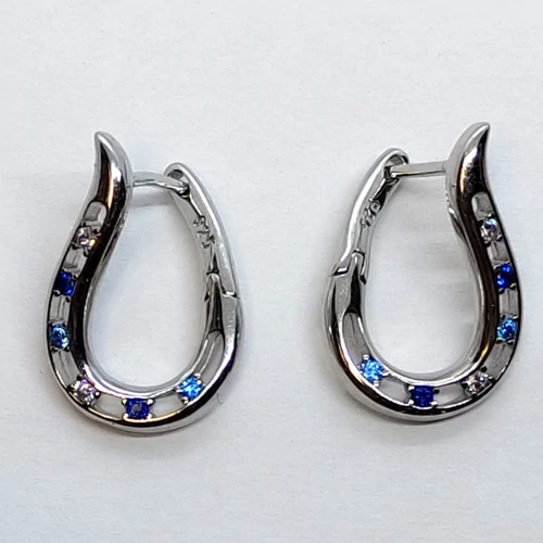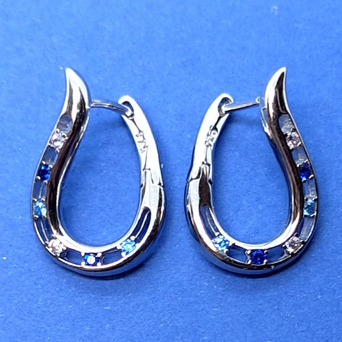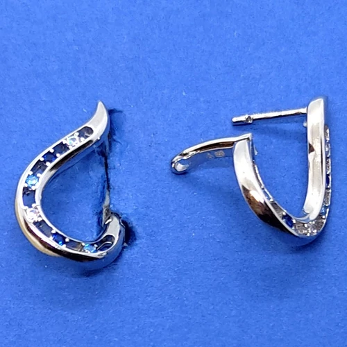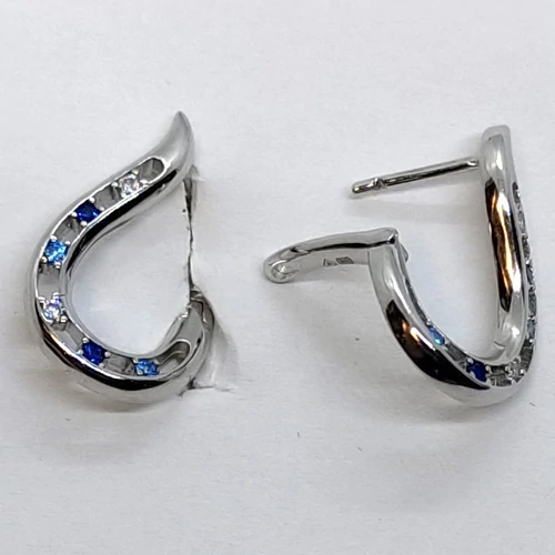 | Hullámos formájú, különleges kapcsolódással és fehér, sötétkék, és világoskék cirkon kővel díszített ezüst fülbevaló | |