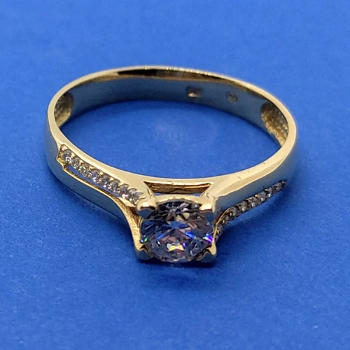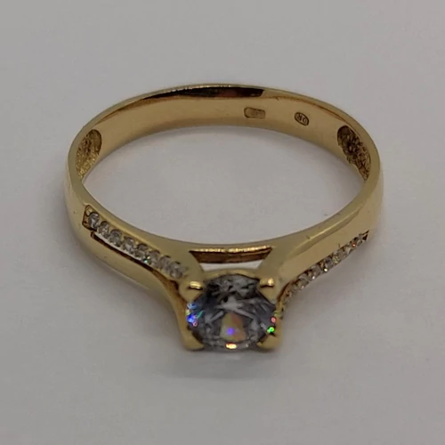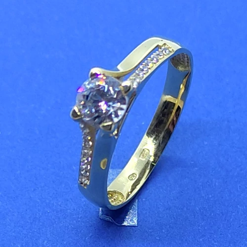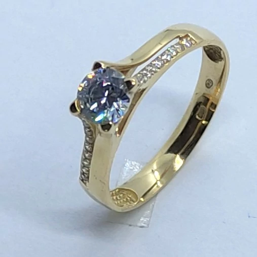 Középen 4 karomba foglalt kerek gyémánt csiszolású, két oldalt ellentétes irányba, fehér cirkon kövekkel díszített arany eljegyzési gyűrű | |
