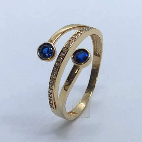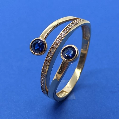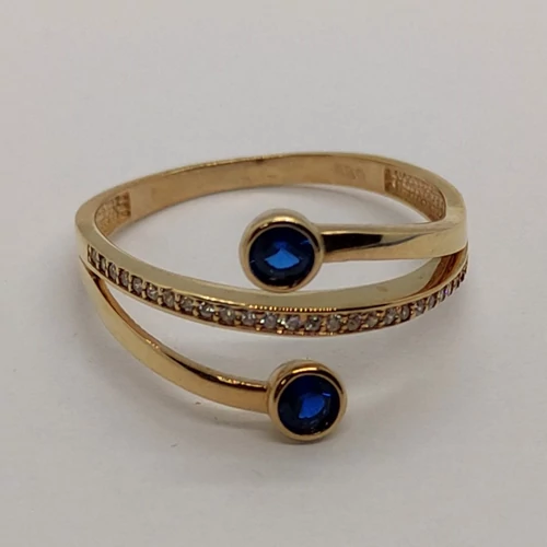 | Középen sorkővel kirakott, két oldalt buttonos foglalatba foglalt kék színű cirkon kővel díszített arany gyűrű | |