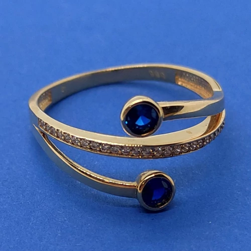 Középen sorkővel kirakott, két oldalt buttonos foglalatba foglalt kék színű cirkon kővel díszített arany gyűrű