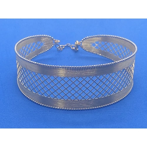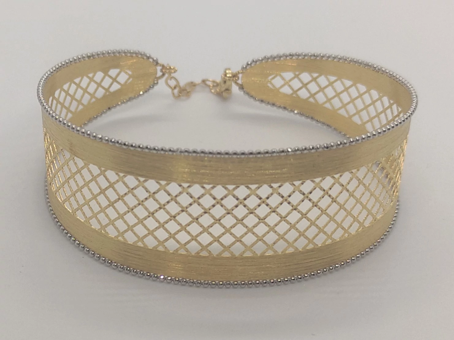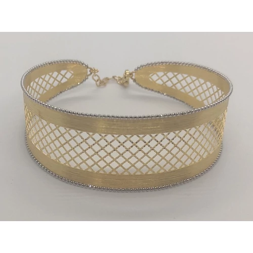 | Nagyon mutatós, széles, középen rácsos mintájú romantikusnak ható, biztonsági lánccal bővíthető méretű gyönyörű arany karkötő | |