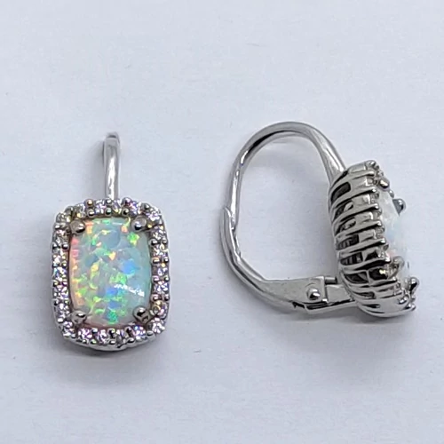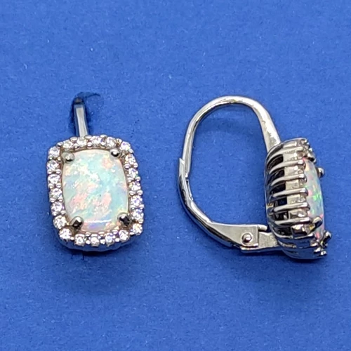 | Téglalap alakú fehér cirkon sorkővel keretezett 4 karomba foglalt fehér opál ezüst fülbevaló | |