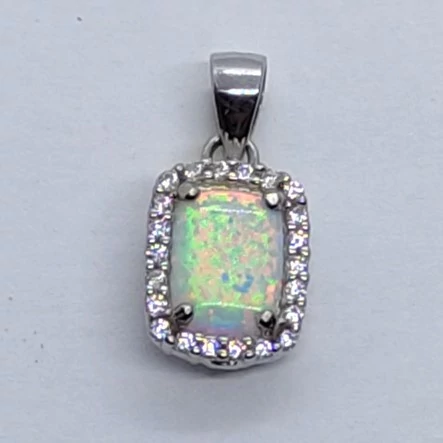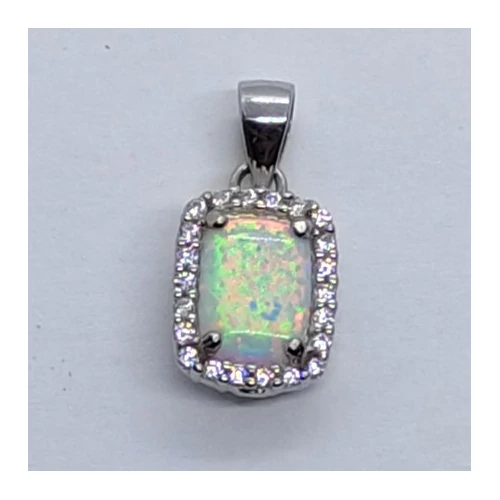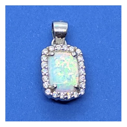 | Téglalap alakú fehér cirkon sorkővel keretezett 4 karomba foglalt fehér opál ezüst medál | |