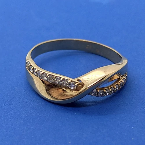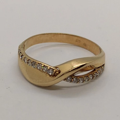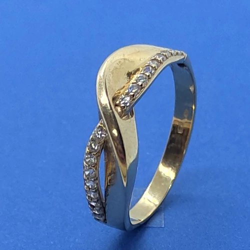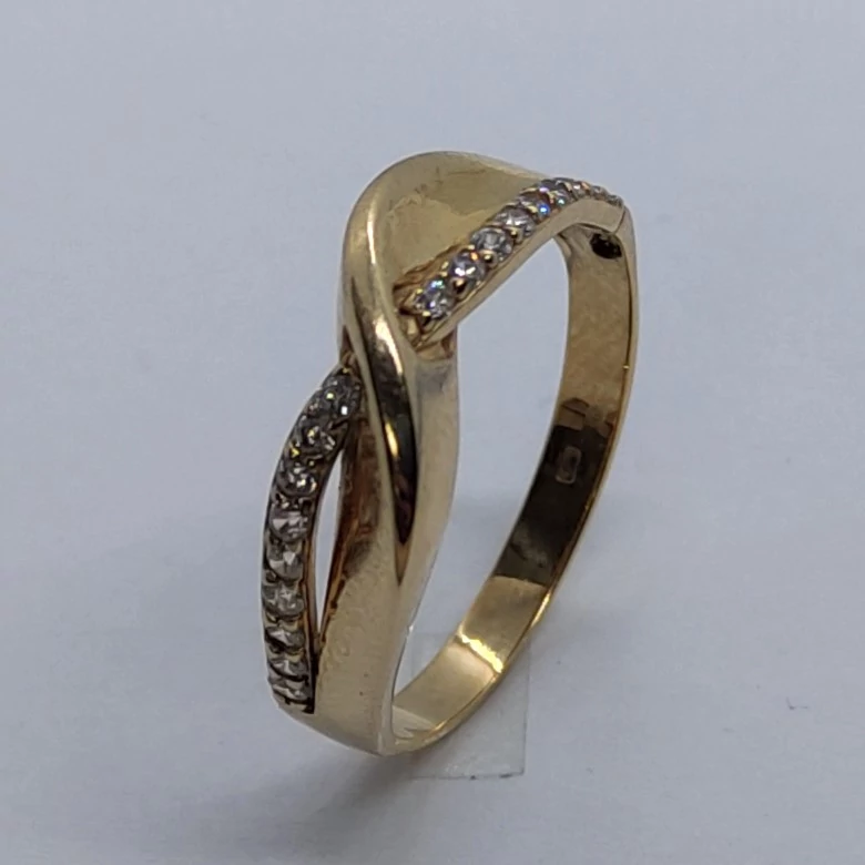 | Végtelen jelre emlékezetető fejrészű, két oldalt ellentétes irányban hullám vonalasan cirkon kővel kirakott arany gyűrű | |
